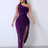 Foreign Trade Sleeveless One Shoulder Slash Neck Sequins Gorgeous Slit Women’s Dress