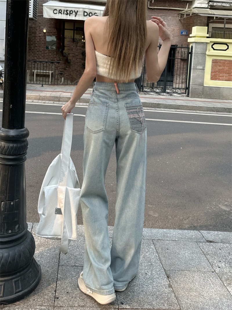 Summer Washed High Waist Loose Slim Wide Leg Jeans Women's Design Light Blue Narrow Straight Floor-length Pants