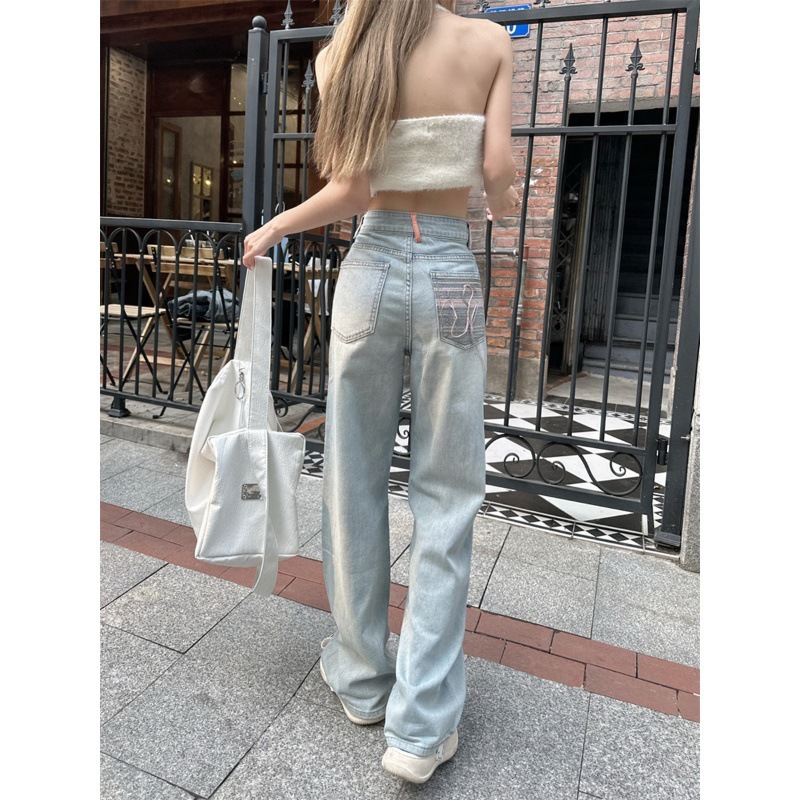 Summer Washed High Waist Loose Slim Wide Leg Jeans Women’s Design Light Blue Narrow Straight Floor-length Pants