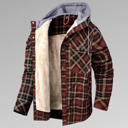 Men’s Long Sleeve Velvet Thickened Hooded Plaid Shirt Coat