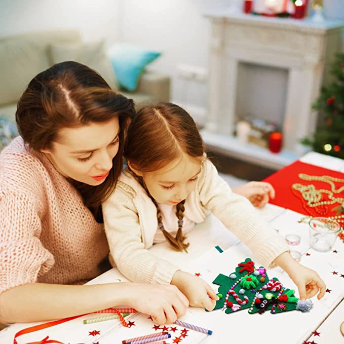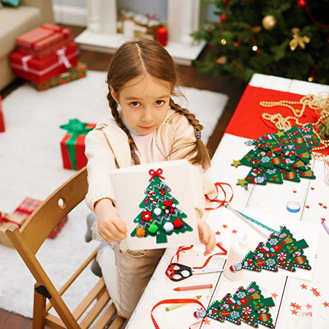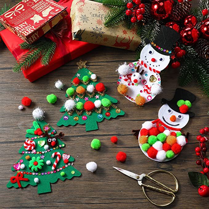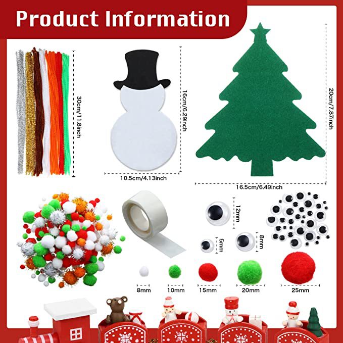6 x Felt Snowman 6 x Felt Christmas Tree A bundle of fur strips A bag of fluffy balls 1 brick and stone sticker sticker 1 double-sided adhesive tape 1 pack of eyes