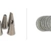 Accessories: 13 stainless steel cookie press molds and 8 pastry piping nozzles