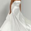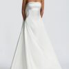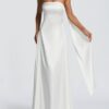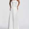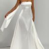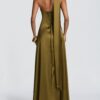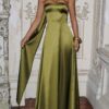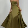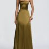 The Morven Maxi Dress in deep olive features a non-stretch satin fabric with a straight, strapless neckline and a fitted bodice that gracefully flows into a full A-line skirt. It includes a lace-up back for a tailored fit and comes with a versatile satin scarf.