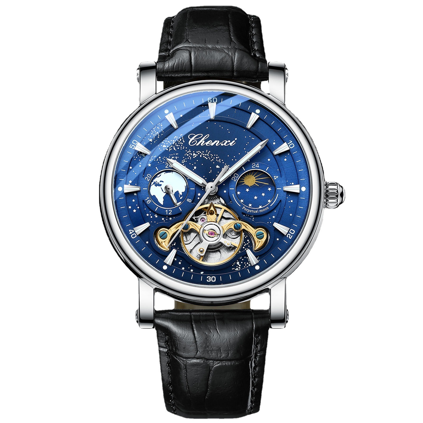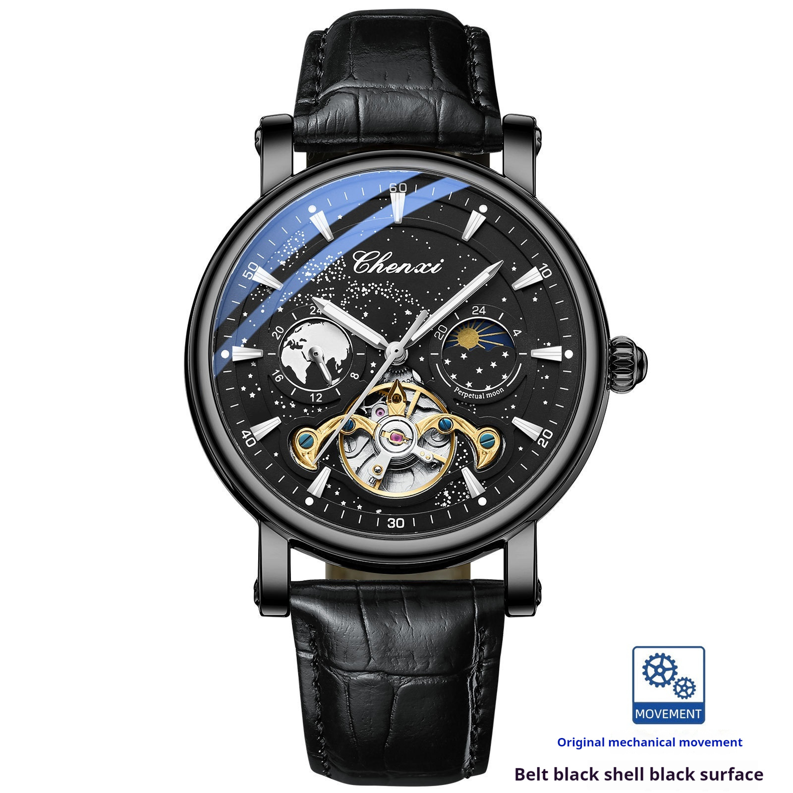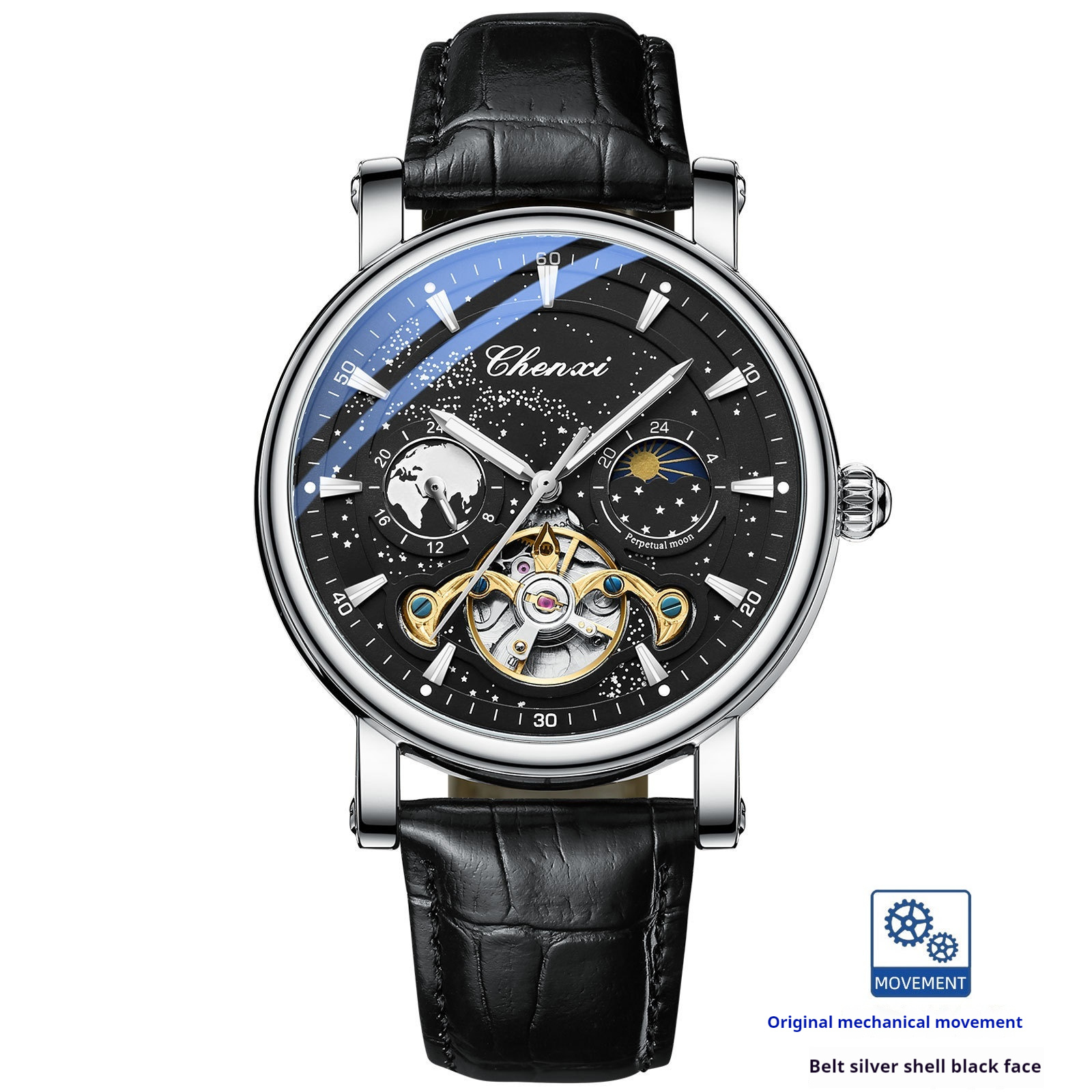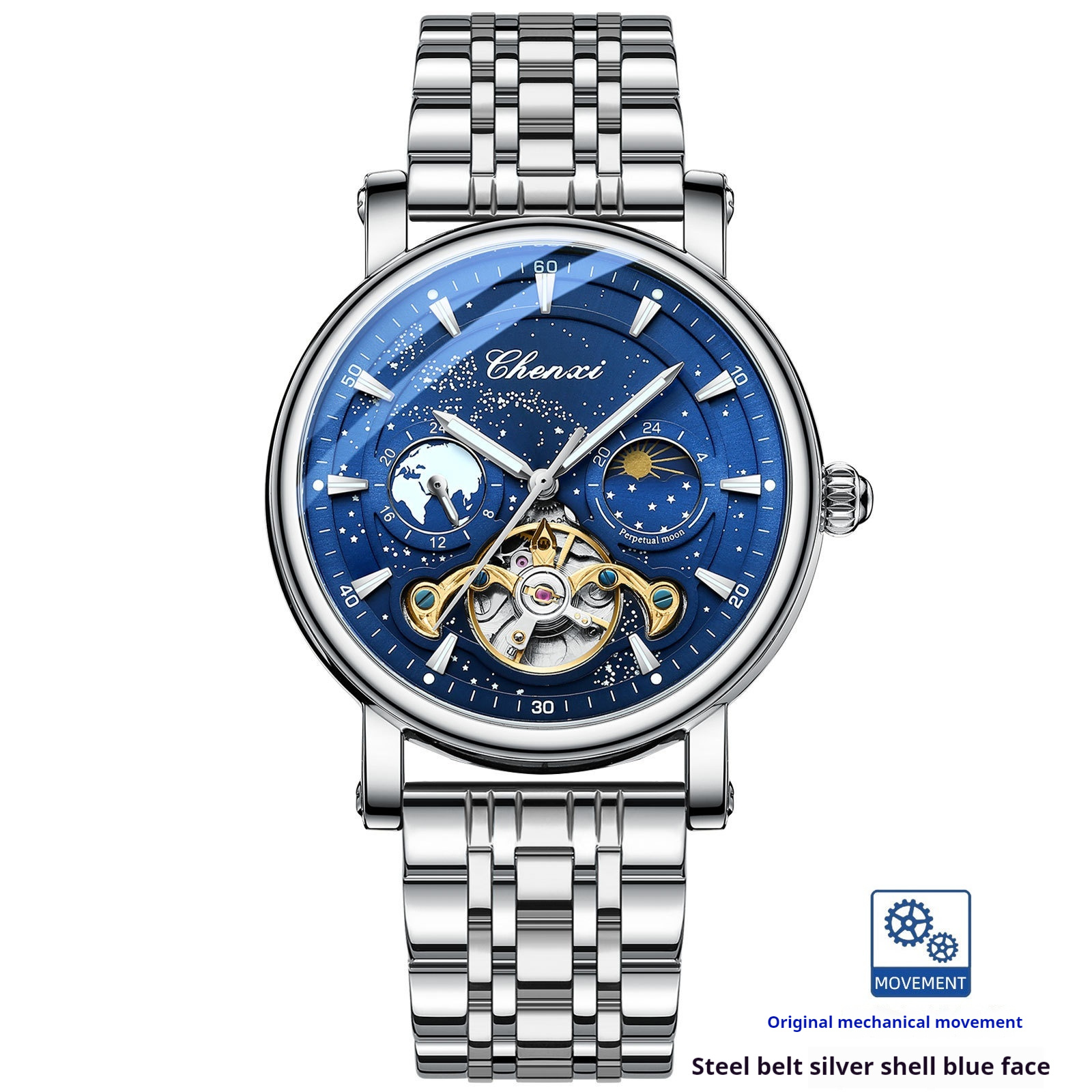 Color: silver shell blue surface with mechanical watch, silver shell black surface with mechanical watch, black cover black surface with mechanical watch, rose shell blue surface with mechanical watch, silver case black surface solid steel belt mechanical watch, silver Watch Case Blue surface solid steel belt mechanical watch